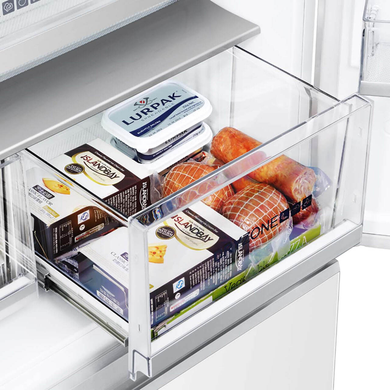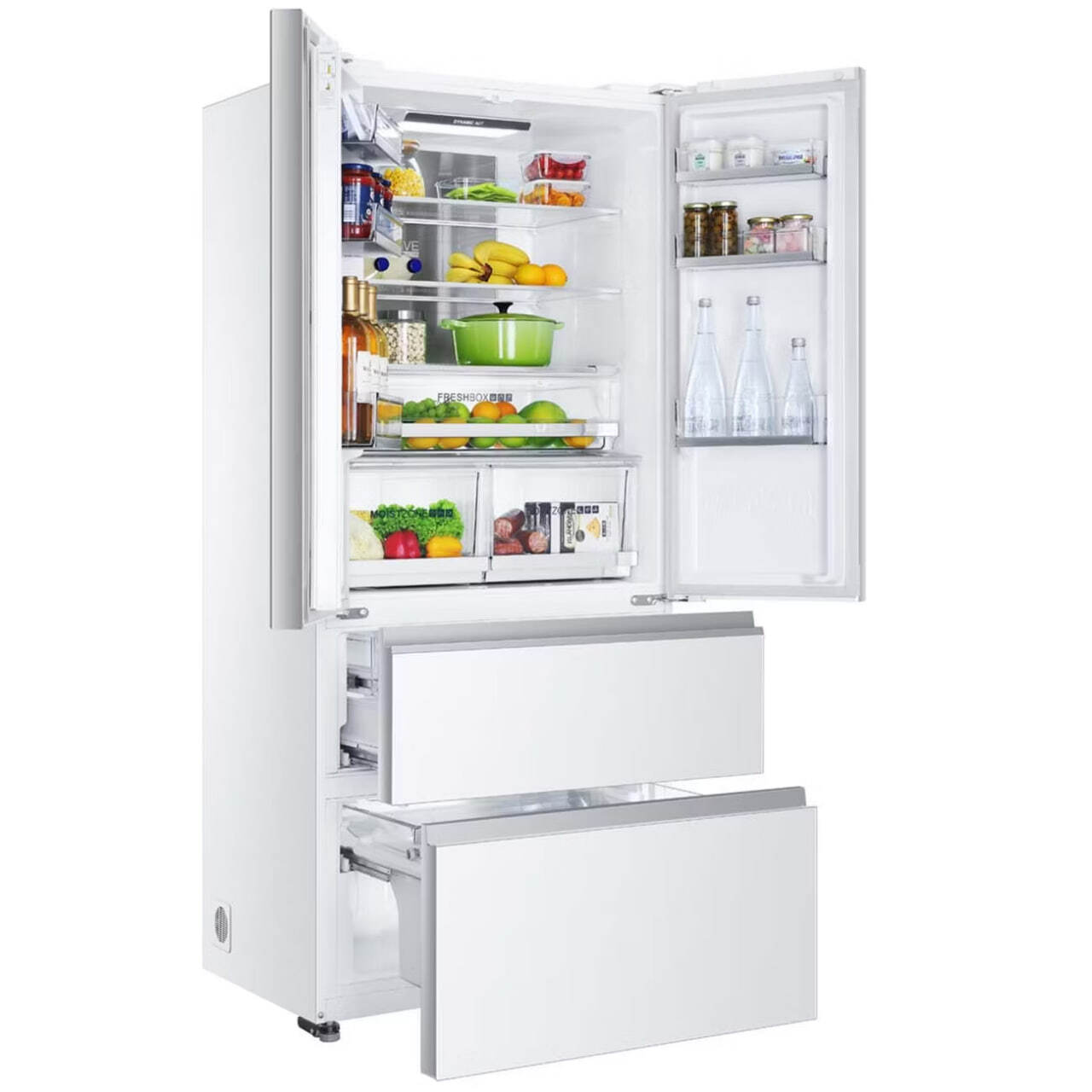 Многодверный холодильник Haier HB18FGWAAARU, белый — вместительная модель общим объемом 508 л. Прибор подойдет для большой семьи и тех, кто предпочитает закупать продукты впрок и делать сезонные заготовки. • Компрессор инверторного типа Отличается экономичным энергопотреблением класса А++ (298 кВт*ч), высокой надежностью и низким уровнем шума: он не превышает 38 дБ. • Ящики Humidity и Dry zone Представляют собой две зоны свежести: влажную и сухую. Первая предназначена для фруктов, овощей, зелени, вторая — для скоропортящихся продуктов, например, охлажденного мяса, рыбы, полуфабрикатов. • Технология Active Fresh Sensors Обеспечивает равномерное распределение прохлады по всем полкам. • Total NoFrost Избавляет от хлопот, связанных с ручным размораживанием — инея на стенках и продуктах не образуется. Холодильная камера оснащена двумя распашными дверями и оборудована тремя полками полной ширины, шестью дверными карманами (по три на двери) и тремя боксами (два — зона свежести). Яркое светодиодное освещение расположено сверху и гарантирует равномерный охват всего пространства. Морозильное отделение представлено двумя выдвижными ящиками и способна заморозить до 14 кг продуктов в сутки. Для быстрого замораживания предусмотрен специальный алюминиевый поднос Fresher PAD. Один из ящиков конвертируемый. У Haier HB18FGWAAARU электронное управление, панель удобно расположена на фасадной стороне двери. Поддерживаются функции «Суперохлаждение», «Суперзаморазивание» и «Отпуск». Первые две будут полезны при большой загрузке, последняя даст возможность не отключать прибор полностью на период отсутствия.